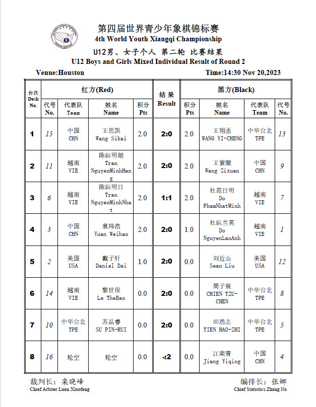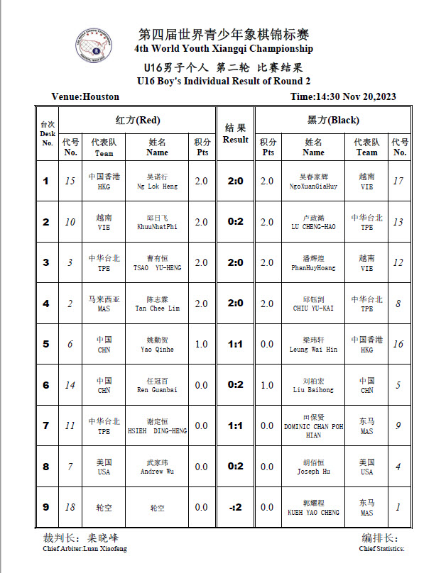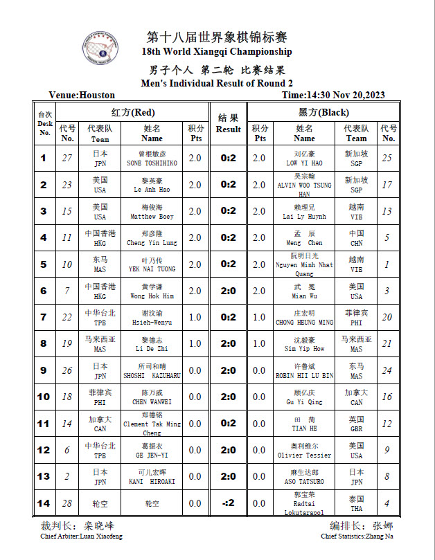 2023 18th World Xiangqi Championships Round 2 Results